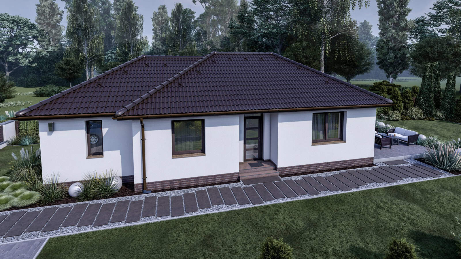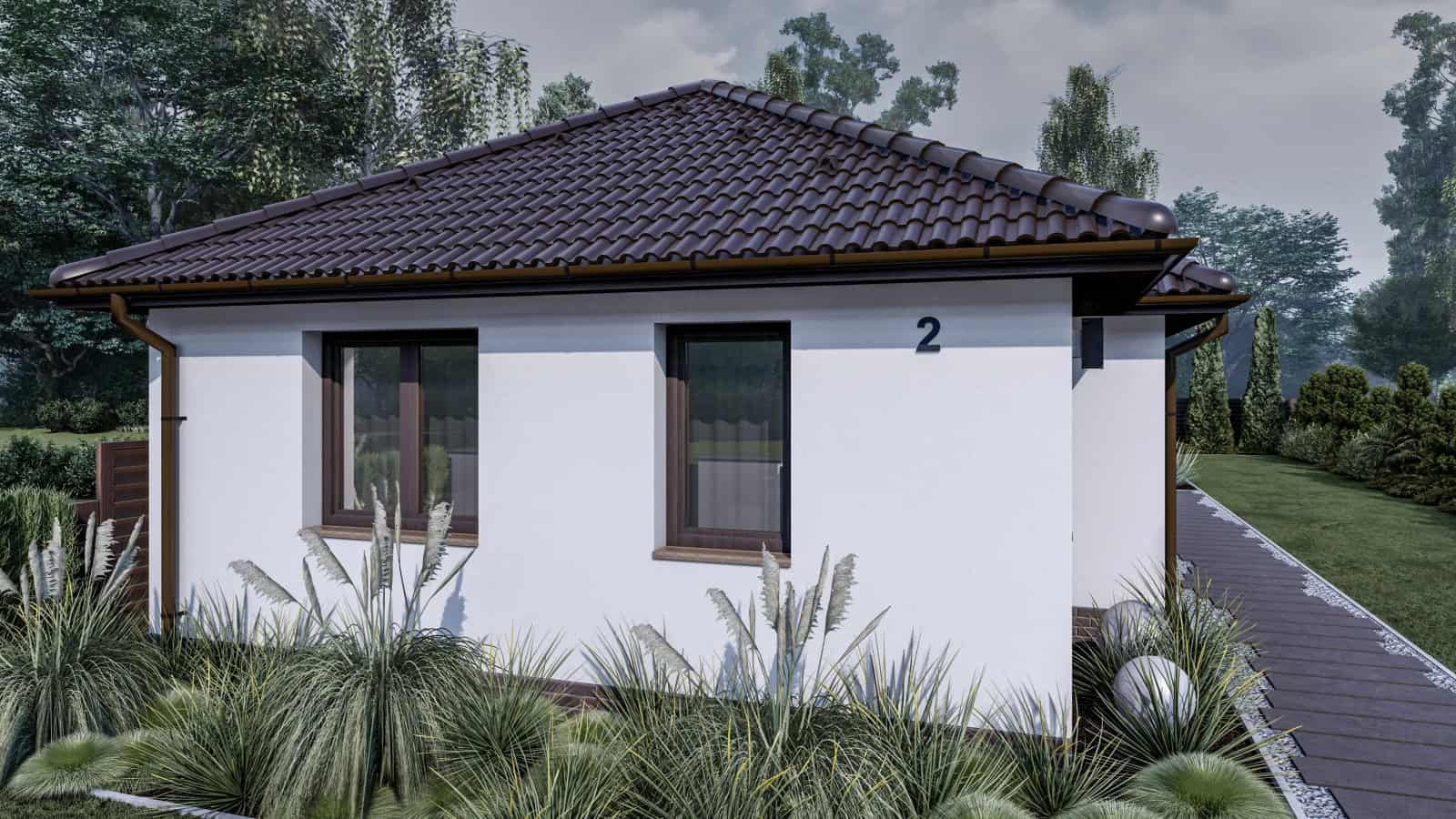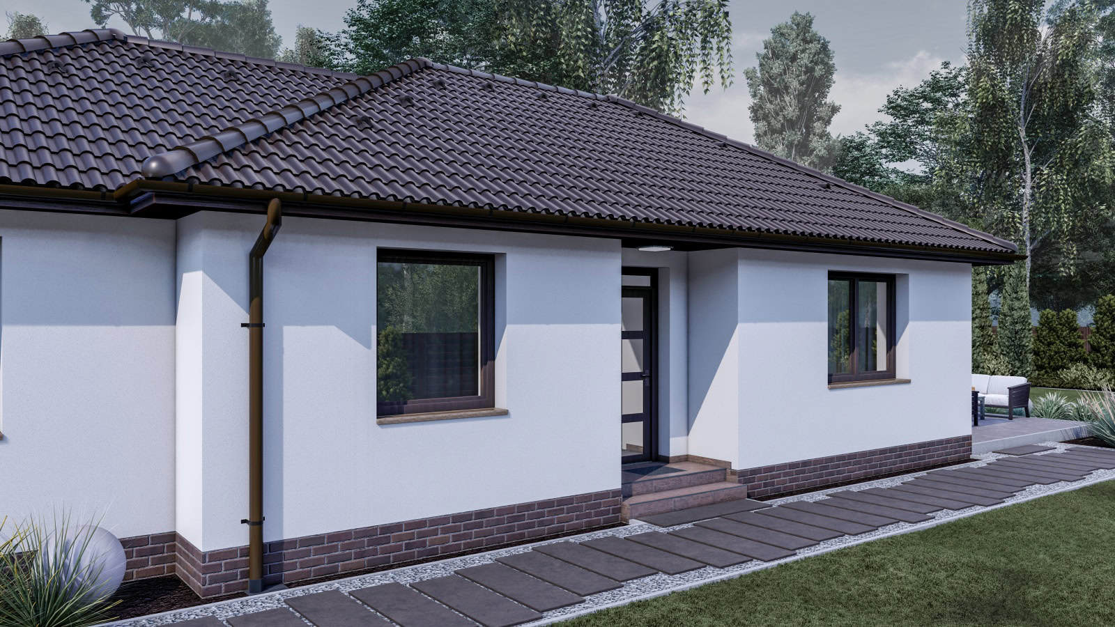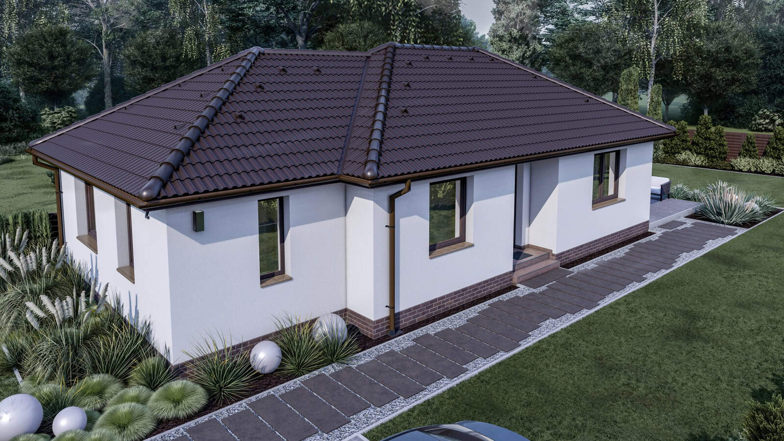 Fafödém, tető: fafödém acél mestergerendával. Fa tetőszerkezet 30°-os hajlásszöggel, horganyzott acéllemez ereszcsatorna, Bramac tetőfedés.