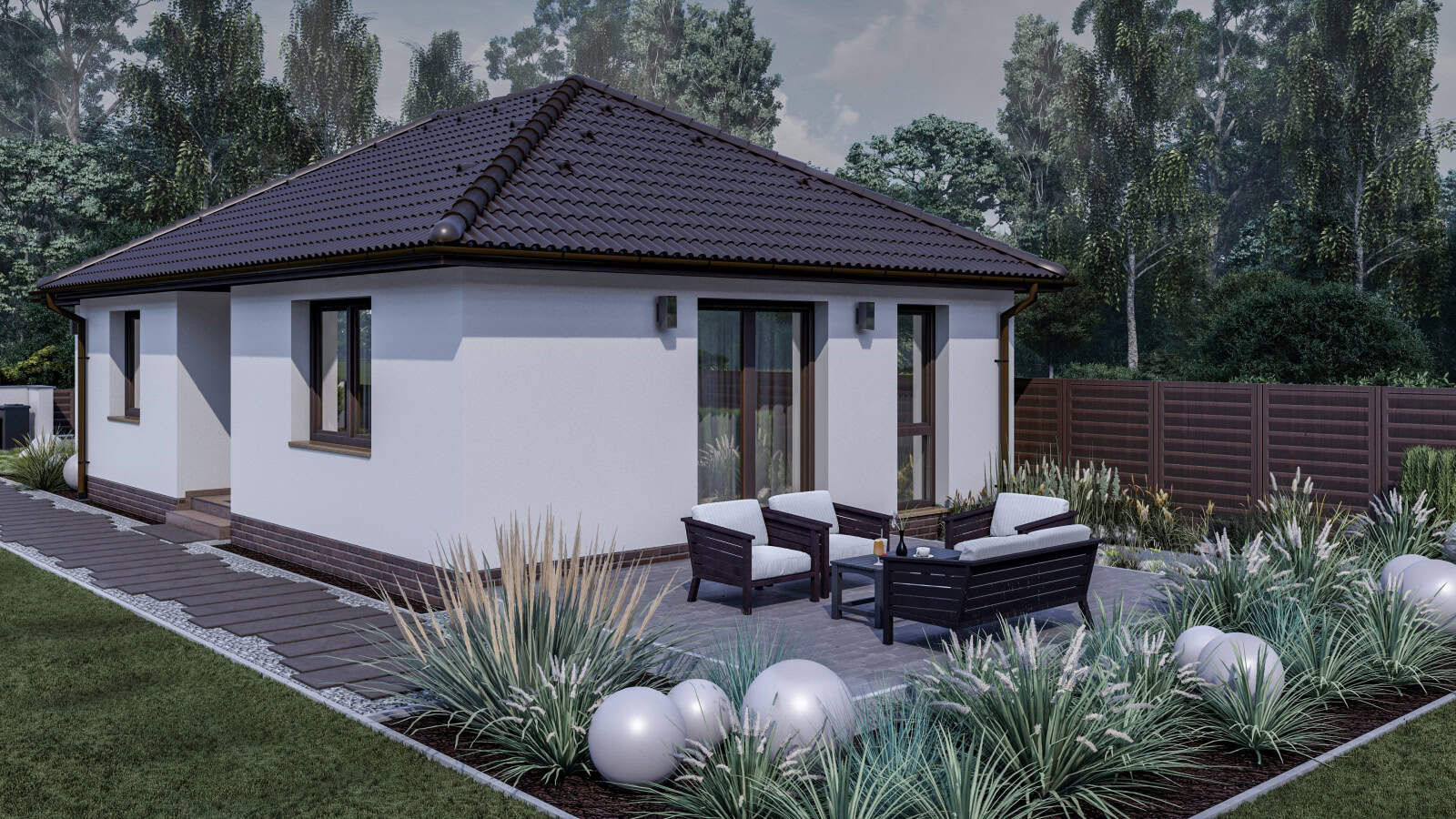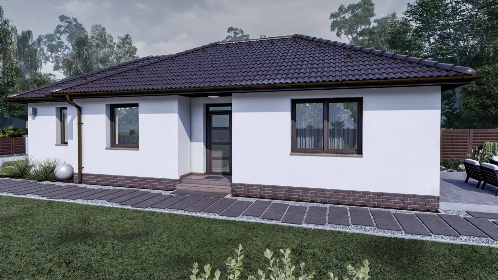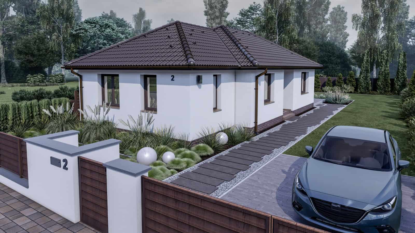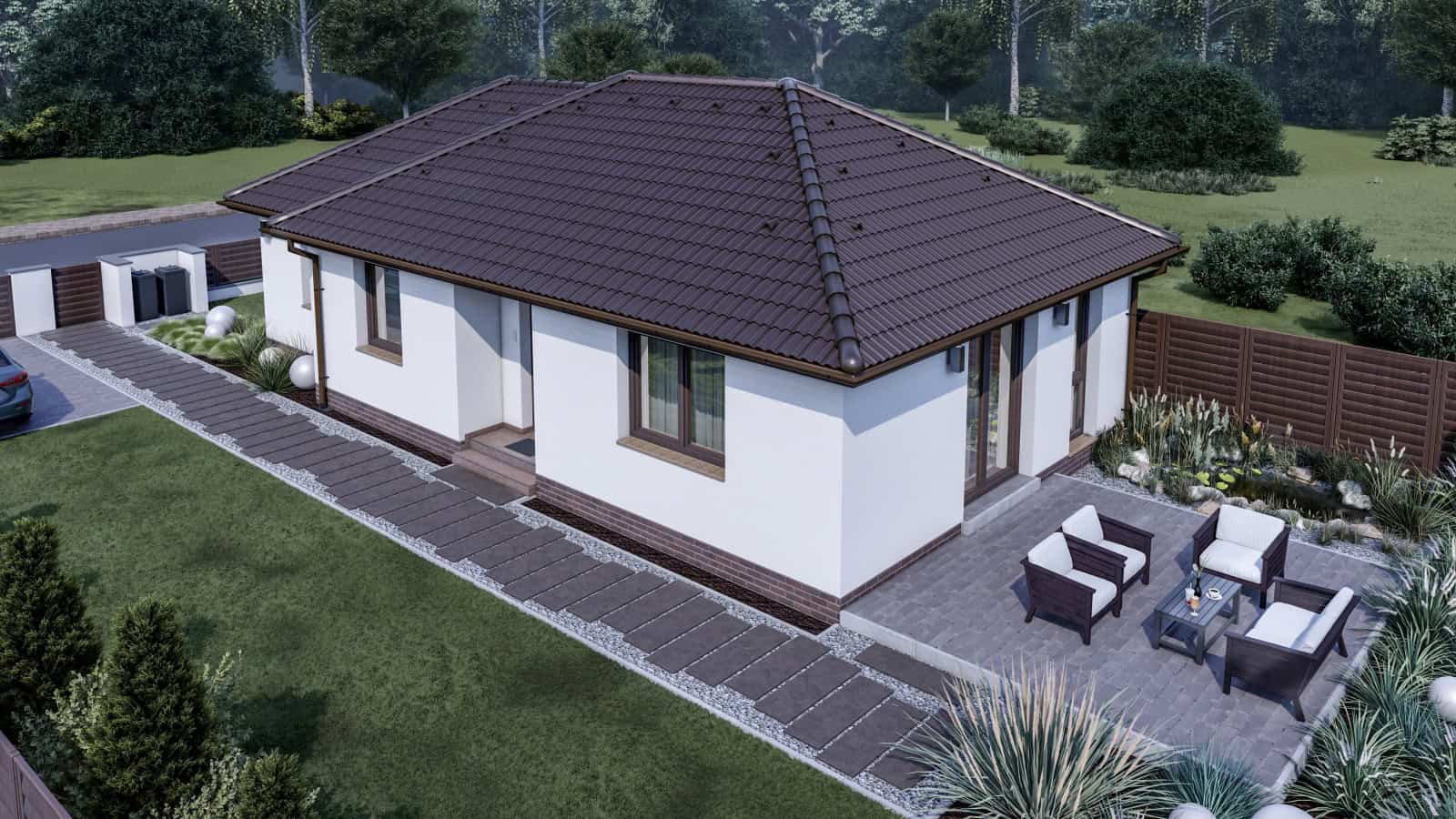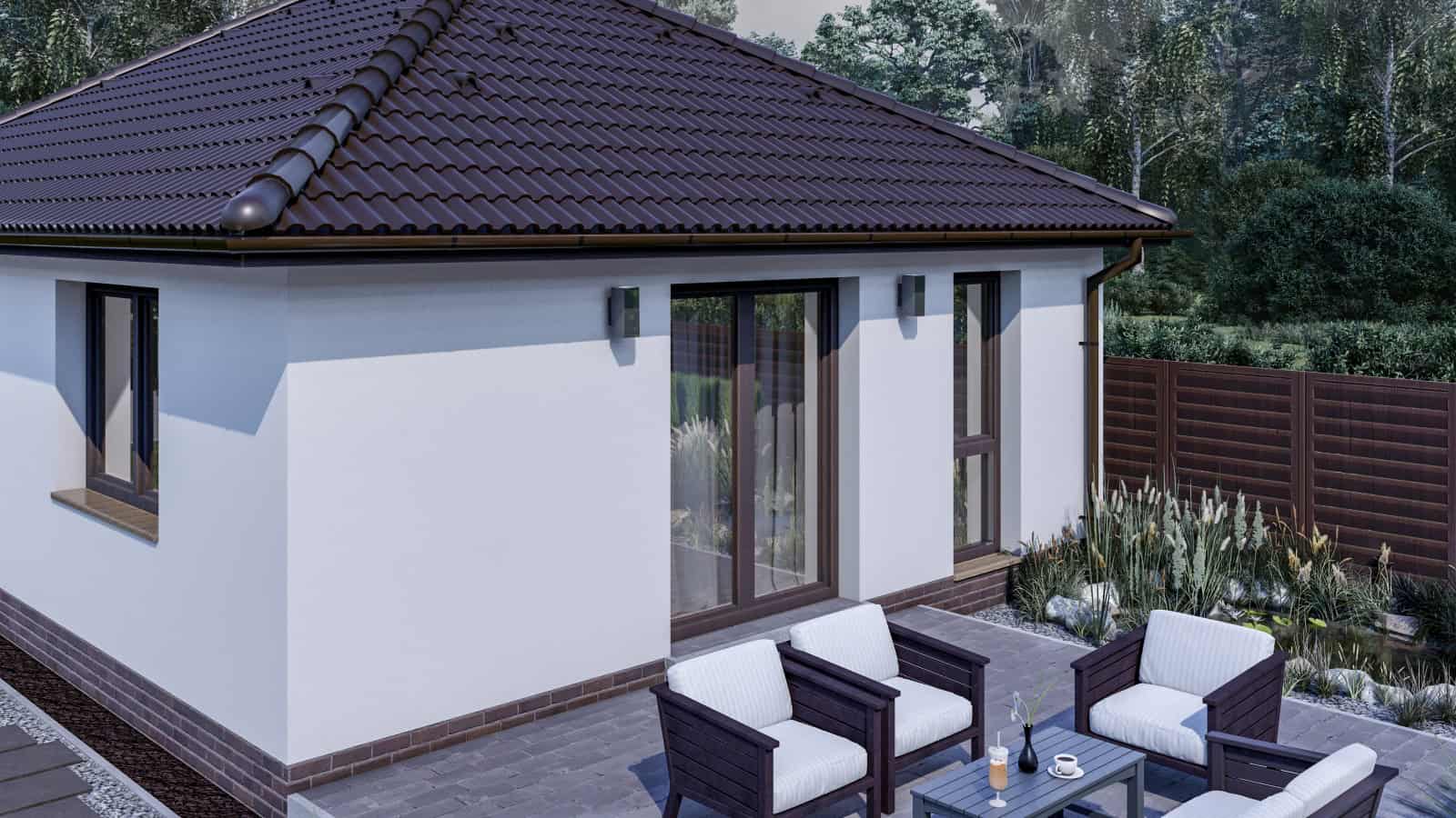 Fafödém, tető: fafödém acél mestergerendával. Fa tetőszerkezet 30°-os hajlásszöggel, horganyzott acéllemez ereszcsatorna, Bramac tetőfedés.